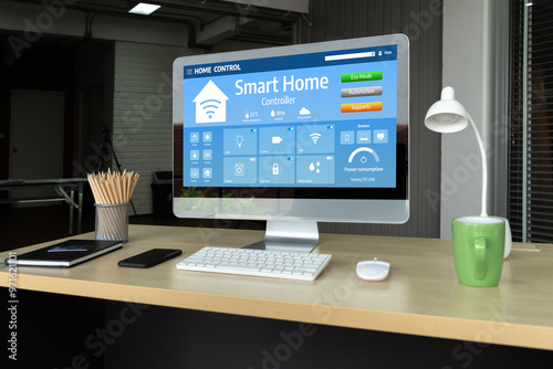 Smart home technology, centric remote control system with digital dashboard for air conditioning, safety security network or house automation. App software, ui panel programming IOT monitor snugly