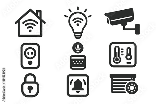 Smart home technology essentials icons set, minimalistic vector illustration of modern living automation, wireless security, voice control, smart devices, IoT symbols collection