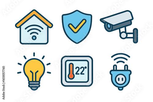 Smart home technology icon set for home automation system. Vector icons for security, energy management, convenience. IoT concept symbols for modern living environments. Colorful pictograms.
