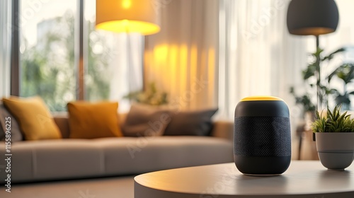 Smart home voice device enhancing modern living space with warm lighting and cozy decor