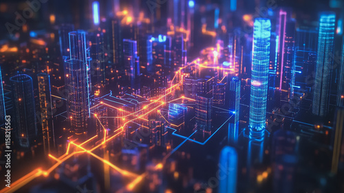 Smart Innovation city with connection cyber security network reciprocity over the night cityscape future wireless digital city and social media networking systems that connects people in the city