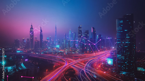 Smart Innovation city with connection cyber security network reciprocity over the night cityscape future wireless digital city and social media networking systems that connects people in the city