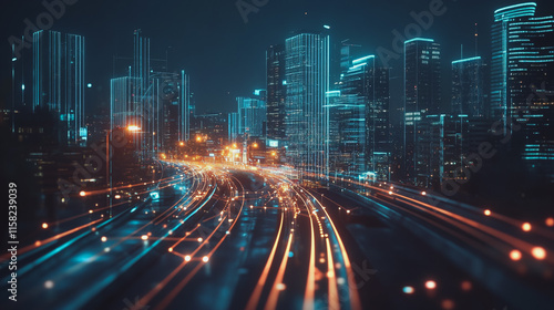 Smart Innovation city with connection cyber security network reciprocity over the night cityscape future wireless digital city and social media networking systems that connects people in the city