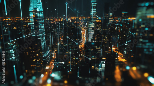 Smart Innovation city with connection cyber security network reciprocity over the night cityscape future wireless digital city and social media networking systems that connects people in the city