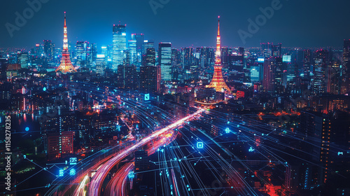 Smart Innovation city with connection cyber security network reciprocity over the night cityscape future wireless digital city and social media networking systems that connects people in the city
