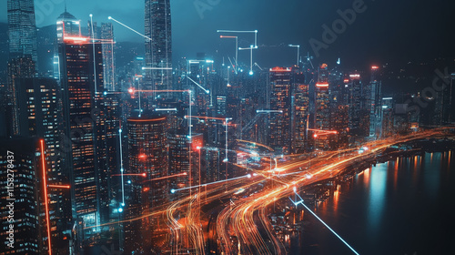 Smart Innovation city with connection cyber security network reciprocity over the night cityscape future wireless digital city and social media networking systems that connects people in the city