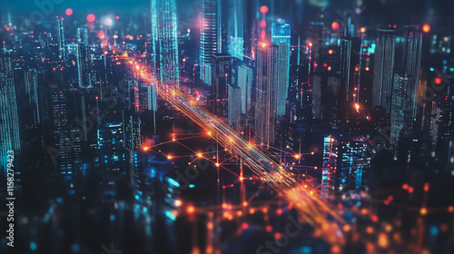 Smart Innovation city with connection cyber security network reciprocity over the night cityscape future wireless digital city and social media networking systems that connects people in the city