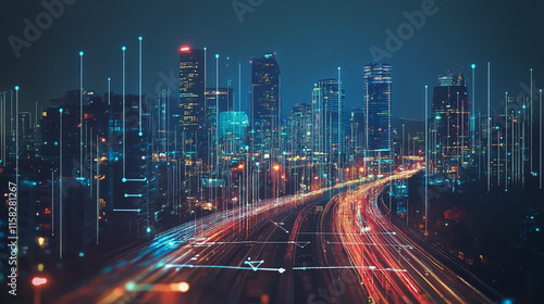 Smart Innovation city with connection cyber security network reciprocity over the night cityscape future wireless digital city and social media networking systems that connects people in the city