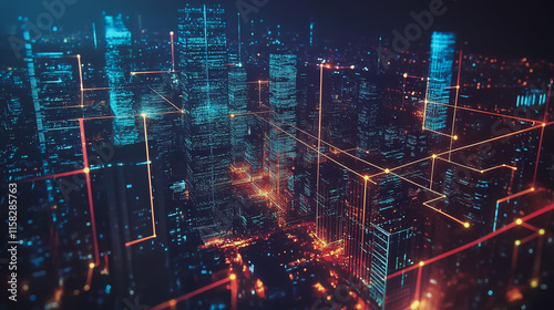 Smart Innovation city with connection cyber security network reciprocity over the night cityscape future wireless digital city and social media networking systems that connects people in the city
