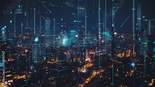 Smart Innovation city with connection cyber security network reciprocity over the night cityscape future wireless digital city and social media networking systems that connects people in the city