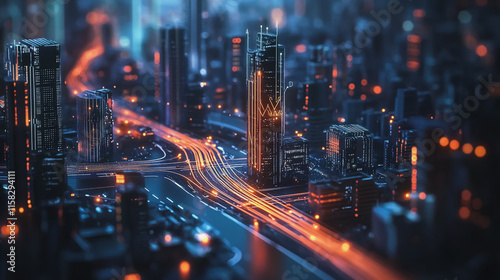 Smart Innovation city with connection cyber security network reciprocity over the night cityscape future wireless digital city and social media networking systems that connects people in the city