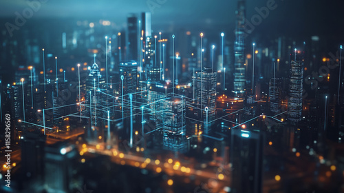 Smart Innovation city with connection cyber security network reciprocity over the night cityscape future wireless digital city and social media networking systems that connects people in the city