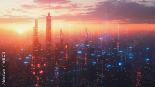Smart Innovation city with connection cyber security network reciprocity over the sunset cityscape future wireless digital city and social media networking systems that connects people in the city