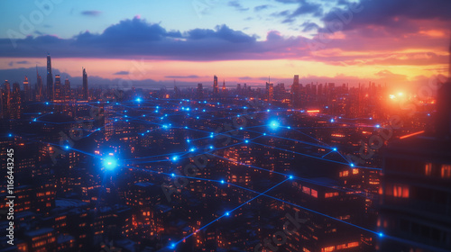Smart Innovation city with connection cyber security network reciprocity over the sunset cityscape future wireless digital city and social media networking systems that connects people in the city