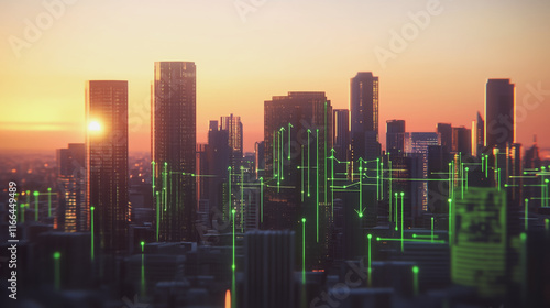 Smart Innovation city with connection cyber security network reciprocity over the sunset cityscape future wireless digital city and social media networking systems that connects people in the city