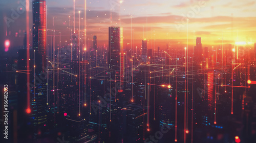 Smart Innovation city with connection cyber security network reciprocity over the sunset cityscape future wireless digital city and social media networking systems that connects people in the city