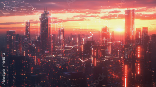 Smart Innovation city with connection cyber security network reciprocity over the sunset cityscape future wireless digital city and social media networking systems that connects people in the city