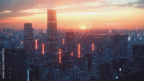 Smart Innovation city with connection cyber security network reciprocity over the sunset cityscape future wireless digital city and social media networking systems that connects people in the city