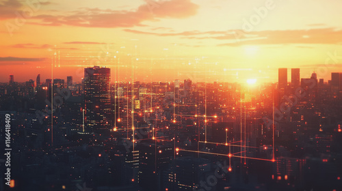 Smart Innovation city with connection cyber security network reciprocity over the sunset cityscape future wireless digital city and social media networking systems that connects people in the city