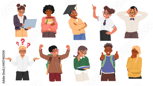 Smart kid nerd geek in glasses showcasing different emotions and gesture isolated set on white