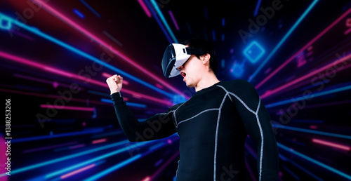 Smart male gamer with VR glasses celebrating for winning the game with glowing neon light. Excited player celebrate for victory in game while using augmented reality technology innovation. Ingenuity.