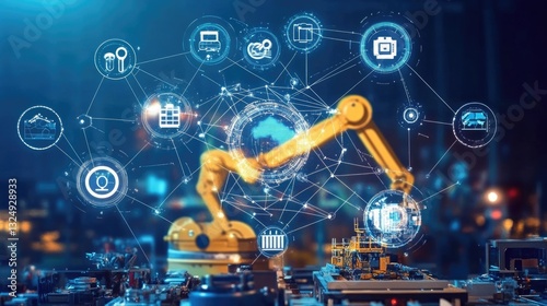 Smart manufacturing plant featuring interconnected IoT-driven robotic systems in full operation.