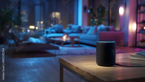 Smart speaker on a table in a dimly lit modern living room