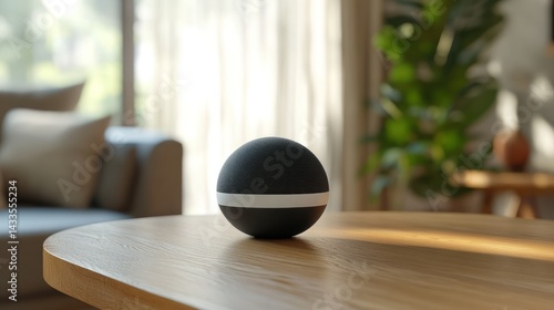 Smart speaker sits on table, merging innovation with lifestyle offering home automation, decor, leisure.