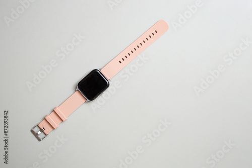 Smart watch with pink rubber bracelet on gray background, flat lay with copy space