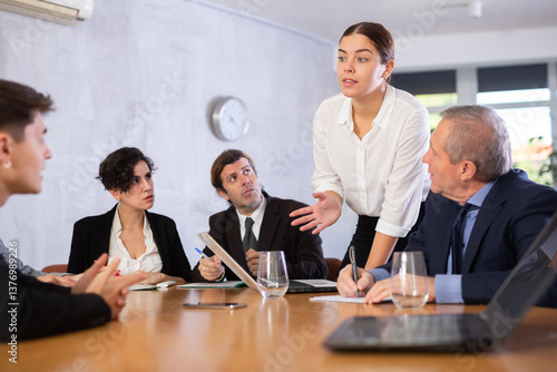 Smart young woman sharing ideas in front of office colleagues of different ages taking notes at table with laptops