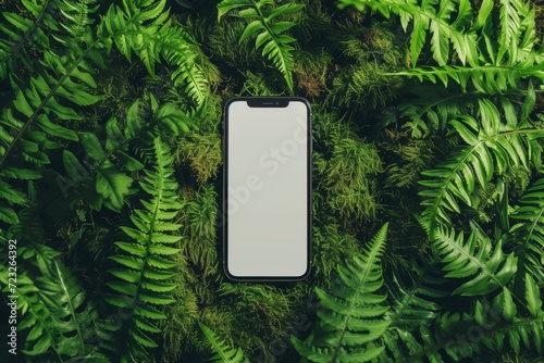 Smartphone against wild plants backdrop. Mockup, template for design. Ecology and zero-waste, green lifestyle. Minimalistic composition. Top view, flat lay