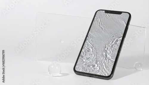 Smartphone displays rippling silver liquid, positioned against clear blocks and orbs on a clean white surface. Minimalist, pristine presentation