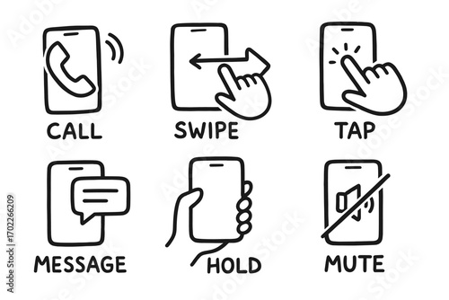 Smartphone icon set: call, swipe, tap, message, hold, mute actions illustrated