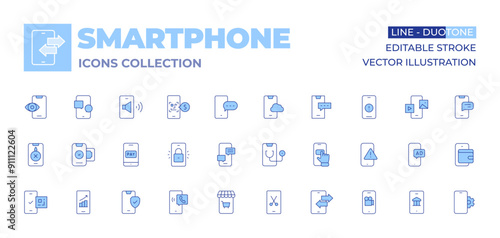 Smartphone icons collection. Line Duotone style, editable stroke. mobile store, mobile, smartphone, repair, phone, pay, mobile payment, lock, doctor, qr code, security