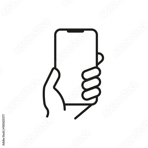 Smartphone line icon. Phone in the hand. Touchscreen phone. Applications, calls, correspondence, communication, connectio. Telephone concept. Vector line icon for Business and Advertising