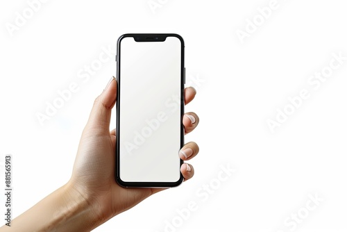 Smartphone mockup on hand with white blank screen created with Generative AI