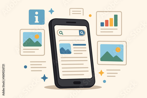 Smartphone search engine concept, mobile screen with internet browser, search bar, floating images, charts, text snippets, info icons, online research discovery vector metaphor