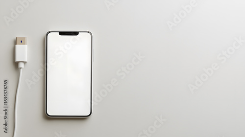 Smartphone with blank screen and USB charging cable on white background, modern technology concept