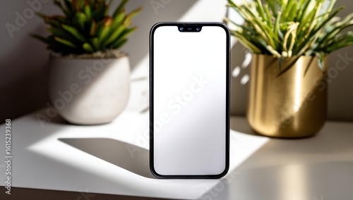 Smartphone with blank white screen stands on a white surface with two plants behind it, bathed in sunlight