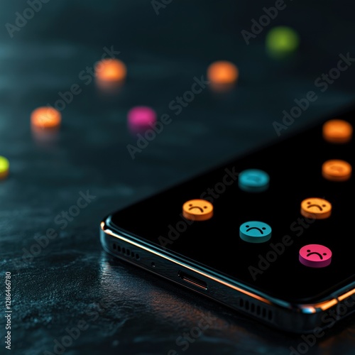 Smartphone with Colorful Emoticons Displayed on Screen Against Dark Background