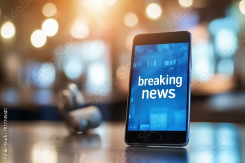 smartphone with the words breaking news displayed prominently on the screen, in a brightly lit room with a blurred