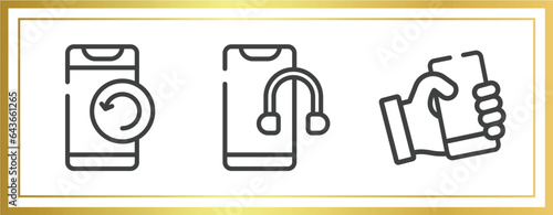 smartphones outline icons set. linear icons sheet included phone with refresh arrows, smartphone headphones, phone with hand vector.
