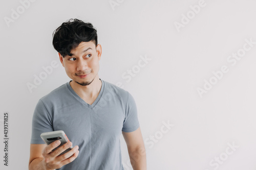 Smile Asian man is happy with the smartphone application isolated on white wall.