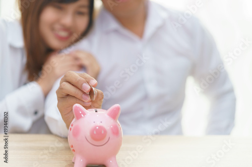 Smile couple putting a coin into a pink piggy bank on wooden desk - save money for the future.