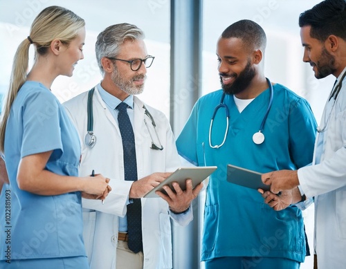 Smile, healthcare and doctors reading on a tablet for results, medical advice or planning.
