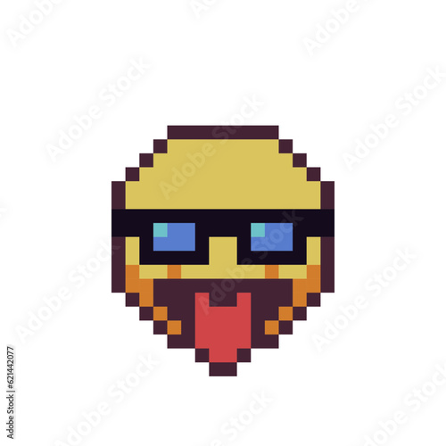 Smile in blue glasses shows tongue pixel art icon, tease emoticon, cute face, cartoon character. 8-bit style. Isolated abstract colorful vector illustration.