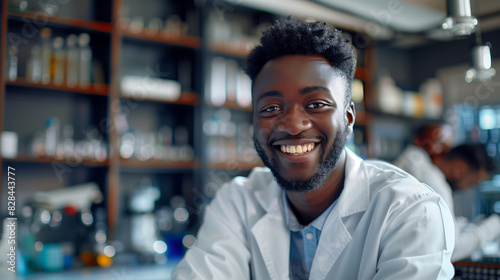 Smiling African American Male Scientist in Laboratory, Wearing Lab Coat, Scientific Research and Innovation