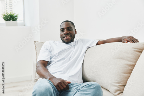 Smiling African American man sitting on a couch in a cozy, bright living room, showcasing relaxed lifestyle and comfort