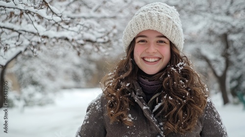 Smiling and cheerful girl in a warm coat and hat posing for a photo in a snowy wintery park, surrounded by snow-covered trees and icy paths.