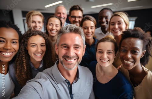 Smiling and diverse office team taking a selfie, showcasing unity among different ages and skin tones.Labor Day, holidays, party events, part-time jobs, hard work, positivity, camaraderie, diversity
